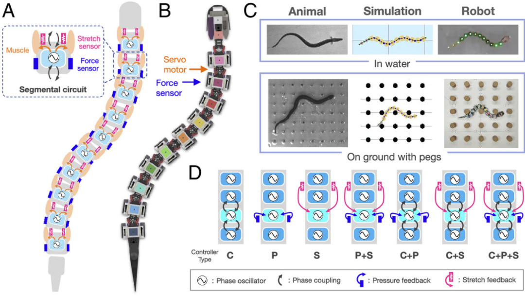 D测试的不同控制配置。C:振荡器之间的中央耦合;P:压力反馈;S:拉伸反馈。通过这种“控制变量”的方法,可以精确地分析出到底是中央指令(C) 更重要,还是局部感觉(P和S) 更重要,或者是两者结合的效果最好。
