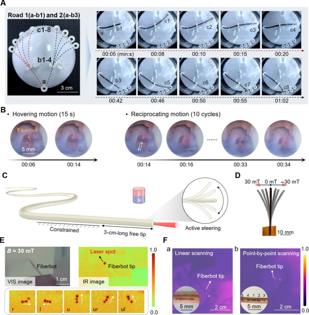 由于光纤机器人外部含有磁性材料,当外部施加磁场时,机器人会产生相应的偏转和运动。研究人员通过实验证明,在30毫特斯拉的安全磁场强度下(该数值远低于临床安全阈值,不会对人体造成伤害),机器人的角度偏转精度可达约1.5°/mT,足以满足关节腔内的精细定位需求。