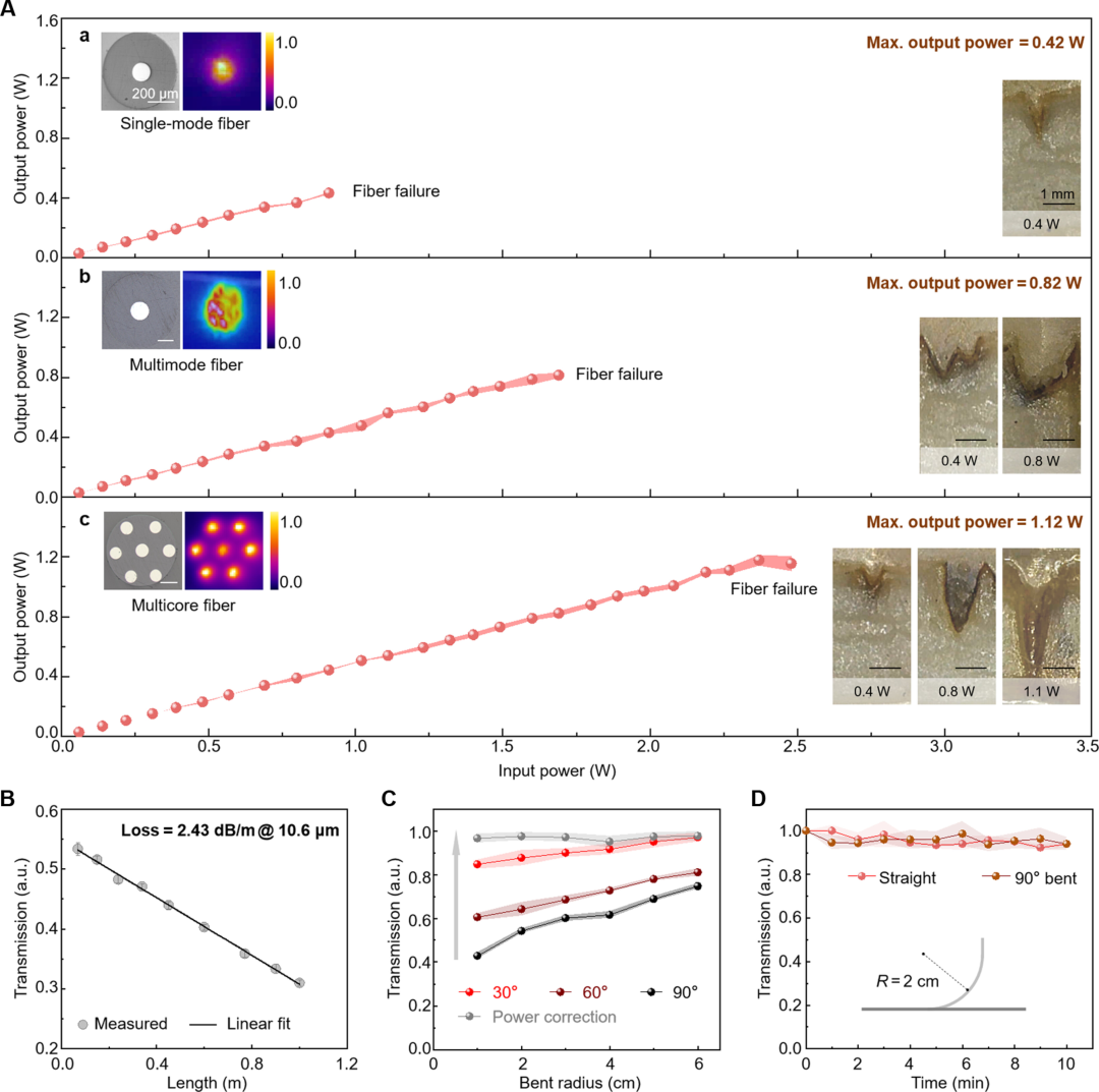 通过多芯设计,这种光纤机器人能够同时传输七束单模激光,总功率阈值达到1.12瓦,足以满足临床消融需求。实验显示,在1.1瓦的输出功率下,仅需20秒就能在骨组织上产生3.5毫米深的消融坑。