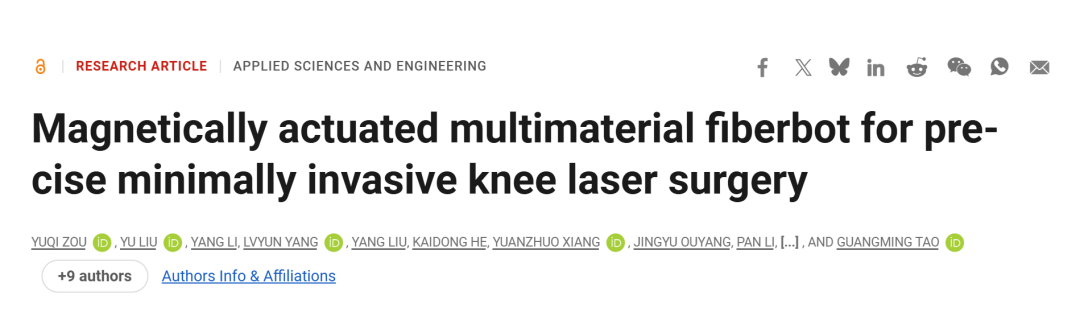 针对这一临床挑战,来自华中科技大学陶光明教授的研究团队开发了一种创新的磁驱动多材料光纤机器人。这个机器人的设计巧妙结合了多种技术:内部是多芯光纤结构,用于传输中红外激光;外部则包裹着磁性弹性体材料,使机器人能够在外加磁场控制下灵活运动。该成果以“Magnetically actuated multimaterial fiberbot for precise minimally invasive knee laser surgery”为题,发表在国际顶级期刊《Science Advances》上,为膝关节微创手术带来了新的技术突破。