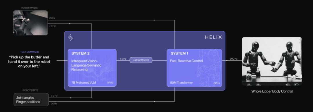 Helix 采用 “系统 1 + 系统 2” 架构:系统 2 为 70 亿参数开源 VLM,以 7-9Hz 频率运行,承担场景与语言理解任务;系统 1 为 8000 万参数 Transformer,以 200Hz 频率运行,负责将语义转化为具体动作。应用层面,搭载该模型的Figure 02机器人能依靠自然语言指令拾取陌生物品、完成双机协同作业,且可在低功耗 GPU 上运行,具备商业部署优势。