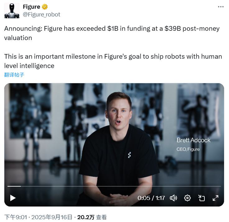 9 月 16 日,美国人形机器人初创公司 Figure AI 在官网宣布,公司 C 轮融资所获承诺资本已超 10 亿美元,投后估值达 390 亿美元(按当前汇率,约合人民币 2774 亿元) 。此轮融资成绩斐然,一举打破了 Figure AI 自身于 2024 年 2 月完成的 6.75 亿美元 B 轮融资所创下的全球人形机器人单笔最高融资记录 。