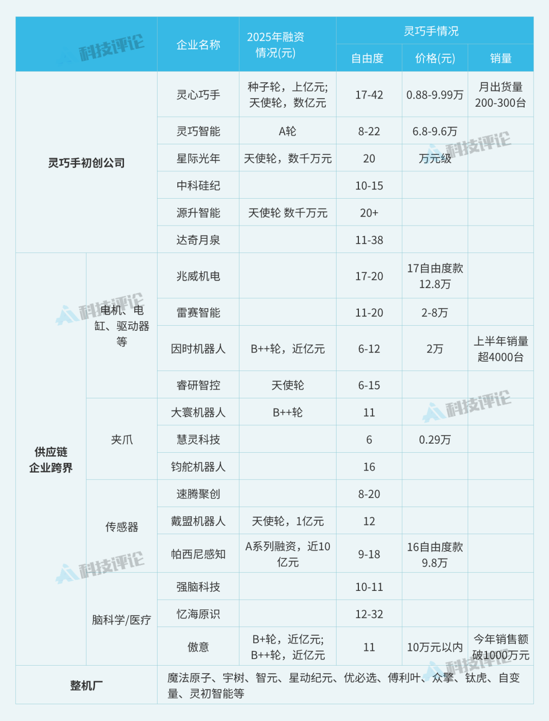 相比之下,挤在前两者的夹缝之中,纯粹的灵巧手厂商在数量上反而少得多。
