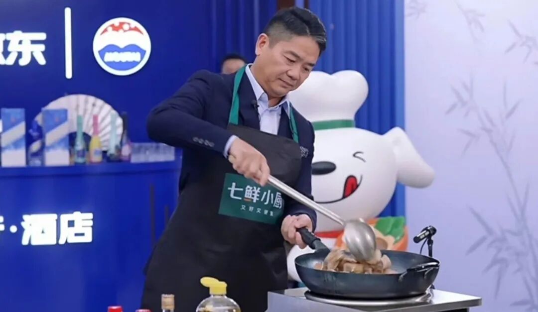 在这风口浪尖上,一个意想不到的大佬,也系着围裙走进了直播间:京东的刘强东。