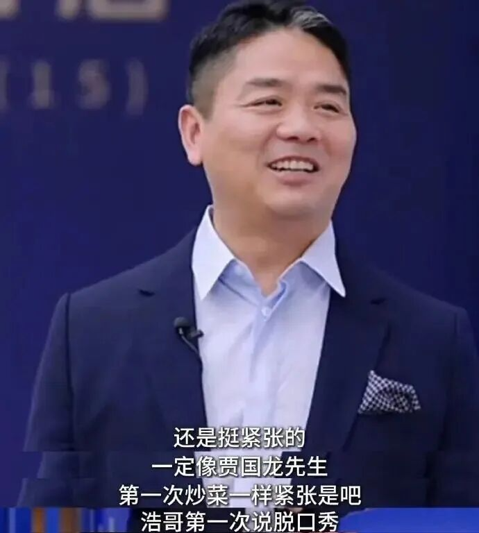 说实话,东哥看着还真有点紧张,他自己也坦白:“像贾国龙先生第一次炒菜一样紧张,像罗永浩第一次说脱口秀一样紧张。”
