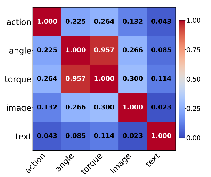 因此在解码器中整合可以更好的利用两者的相关性来增强本体感受。论文中通过归一化HSIC分析了几种模态之间的相关性,发现扭矩信号与关节角度的相关性显著高于其他模态 :