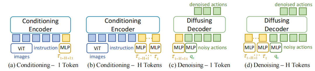 ▲图2|设计了4中嵌入历史扭矩信息的架构来说明将整个扭矩历史整合为单一token输入到解码器中是最优的扭矩历史信息的处理方式:(a)和(b)都在编码器中嵌入扭矩历史信息,(a)是整合成单一token嵌入,(b)是每一帧对应一个token;(c)和(d)都在解码器中嵌入扭矩历史信息,(c)是整合成单一token嵌入,(d)是每一帧对应一个token;(c)(d)效果均好于(a)(b),且(c)效果好于(d)©️【深蓝具身智能】编译