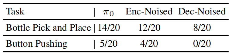 论文中通过在编码器和解码器中加入随机噪声的方式进行实验,对解码器输入添加噪声后,Button Pushing任务成功率从5/20降至0/20,而对编码器添加噪声后仅使成功率从5/20降至 4/20,证明解码器对输入变化更敏感,能更好利用扭矩的细微变化。
