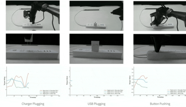 言归正传:众所周知,机器人接触密集型操作(例如按下插座的钮按,然后将充电器插入插座以及拔下插座上的充电器等),都需依赖扭矩等力信号反馈来判断任务状态并实现闭环控制。