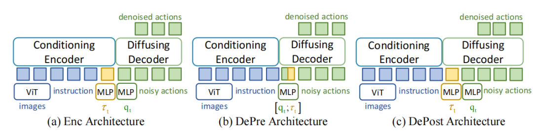 ▲图1|设计了3中嵌入扭矩信号的架构来说明编码器融合扭矩最好:(a)Enc Arch:拼接图像、文本、关节扭矩,然后输入到编码器 (b)DePre Arch: 将关节扭矩和本体关节角度拼接后输入到解码器 (c)DePost Arch: 将前置动作和关节扭矩拼接后输入到解码器,(b)(c)效果都好于(a),并且(c)好于(b)©️【深蓝具身智能】编译