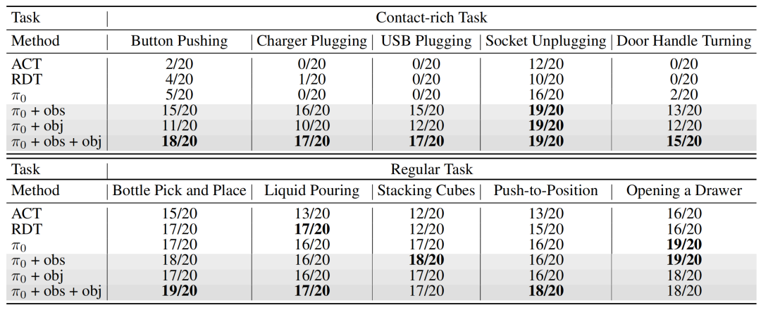 这导致了一个鲜明的能力反差:它们虽能依靠视觉规划完成“叠毛巾”等几何任务,却难以执行“插插头”这类需要精细力控的操作。