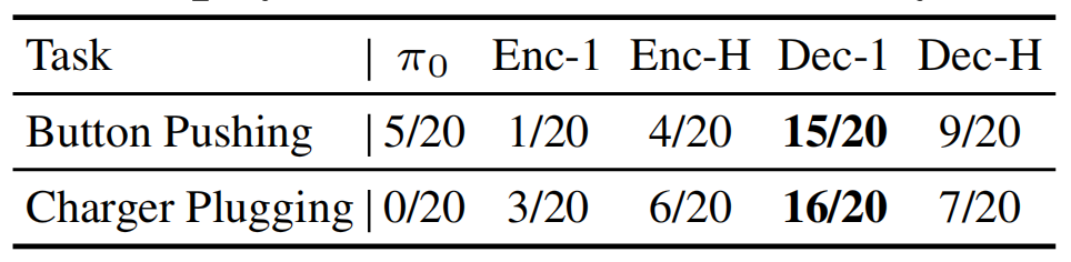论文中分别在编码器上采用单一token和多token、编码器上采用单一token和多token进行实验,可以发现Button Pushing和Charger Plugging2项任务中,编码器上采用单一token的方式整合历史扭矩的效果最好,证明单一token 整合既能保留历史信息,又能维持架构稳定性。
