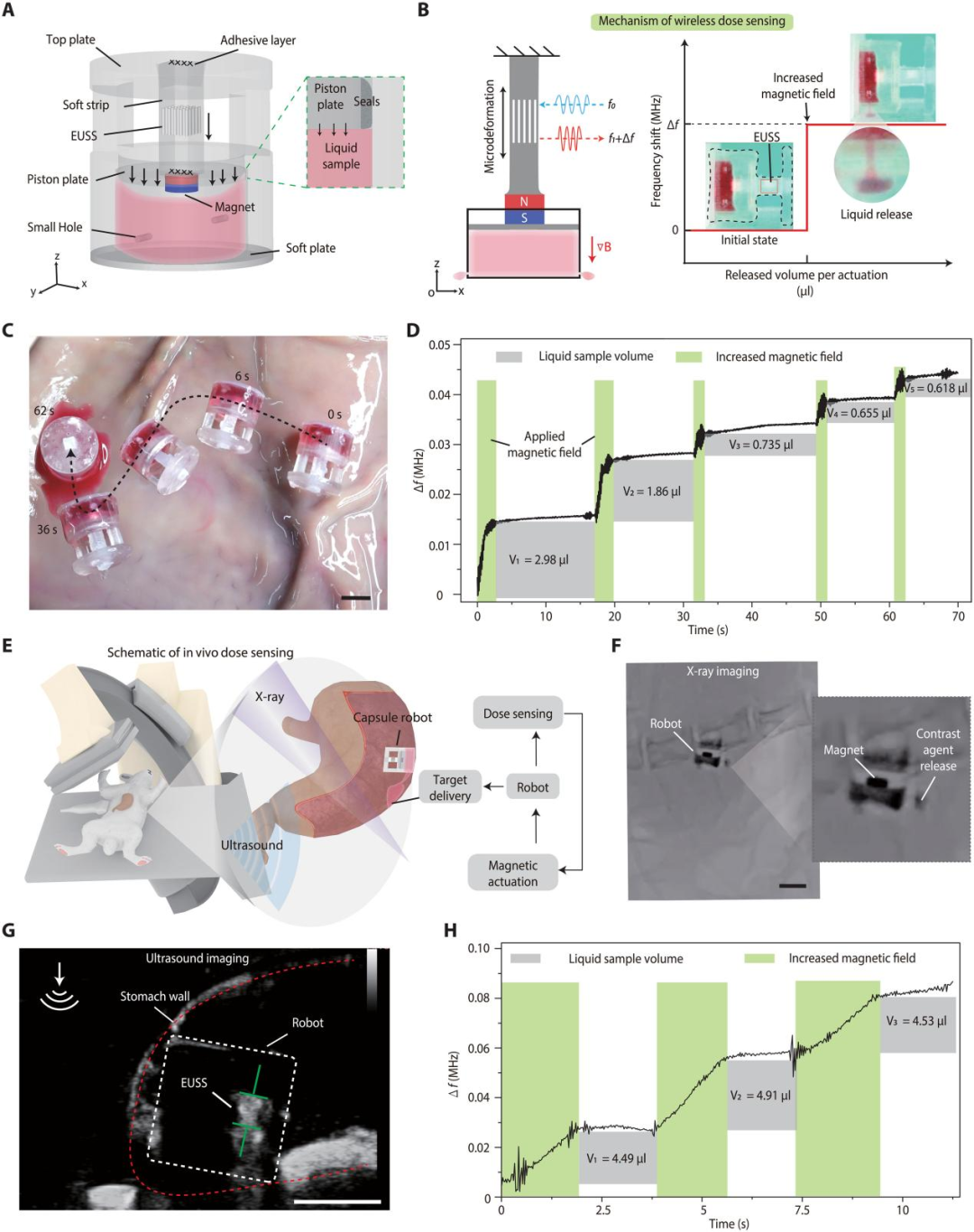 团队开发了一种胶囊型机器人,内部包含药物储腔、磁性活塞和与EUSS连接的软条。当外部磁场驱动活塞运动时,药物被推出微孔,同时EUSS受拉发生形变。通过监测回波频率的变化,系统可反推出释放的药物体积。