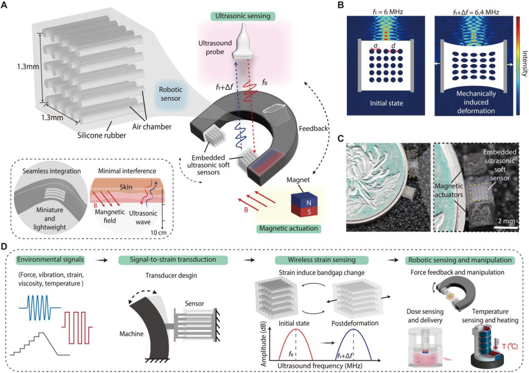 针对上述挑战,来自华中科技大学的研究团队提出了一项创新性的技术:将嵌入式超声波软传感器(Embedded Ultrasonic Soft Sensor, EUSS) 与磁力驱动器结合,构建出既能被无线操控又能实现多参数感知的机器人传感器方法。