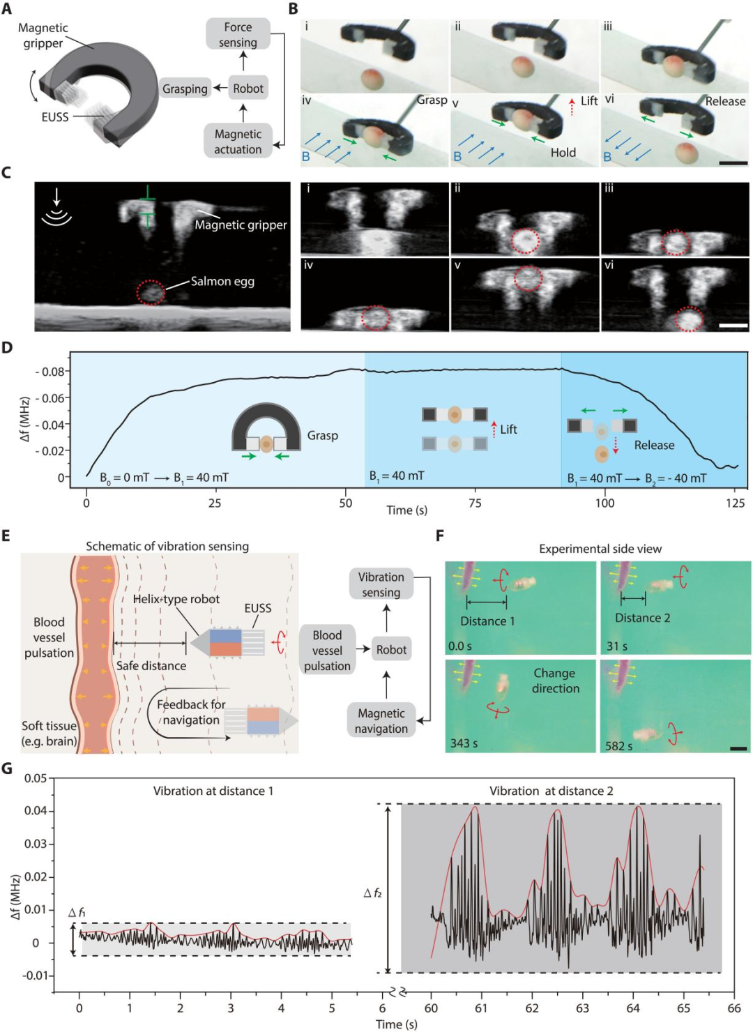 研究团队开发了一种磁性软体夹持器,其末端集成两个EUSS单元。当夹持器接触物体时,EUSS发生形变,通过超声回波频率的偏移可计算出实际受力。实验显示,该夹持器的力灵敏度达到6100 Hz/mN,分辨率高达61.3 μN——足以安全地操作鲑鱼卵这类脆弱对象。