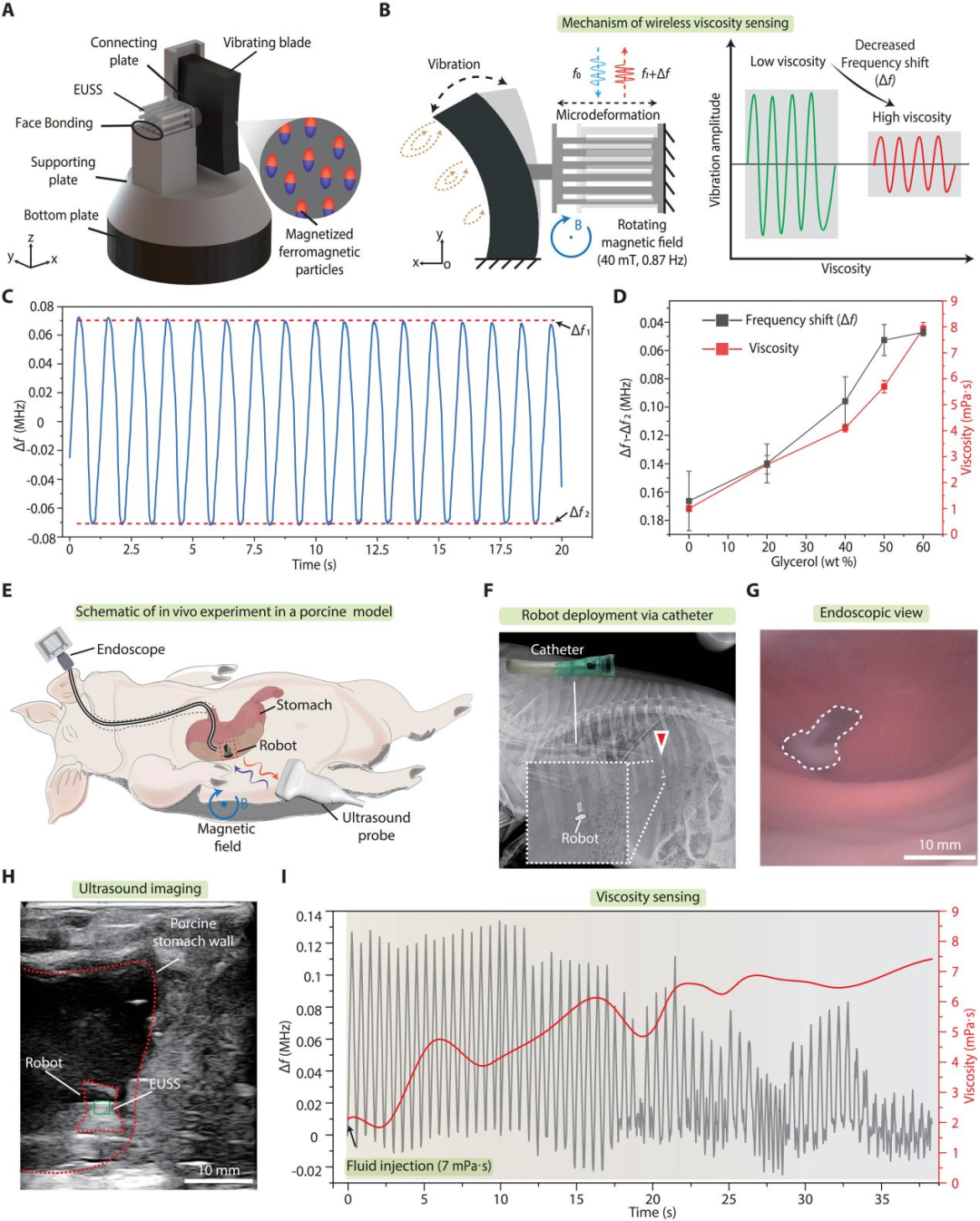研究团队设计了一种粘度传感机器人,其振动板由磁驱材料制成,与EUSS相连。在旋转磁场中,振动板发生周期性运动,其振幅受周围流体粘度阻尼的影响。通过EUSS检测振动幅度对应的频率偏移,即可推算出环境粘度。