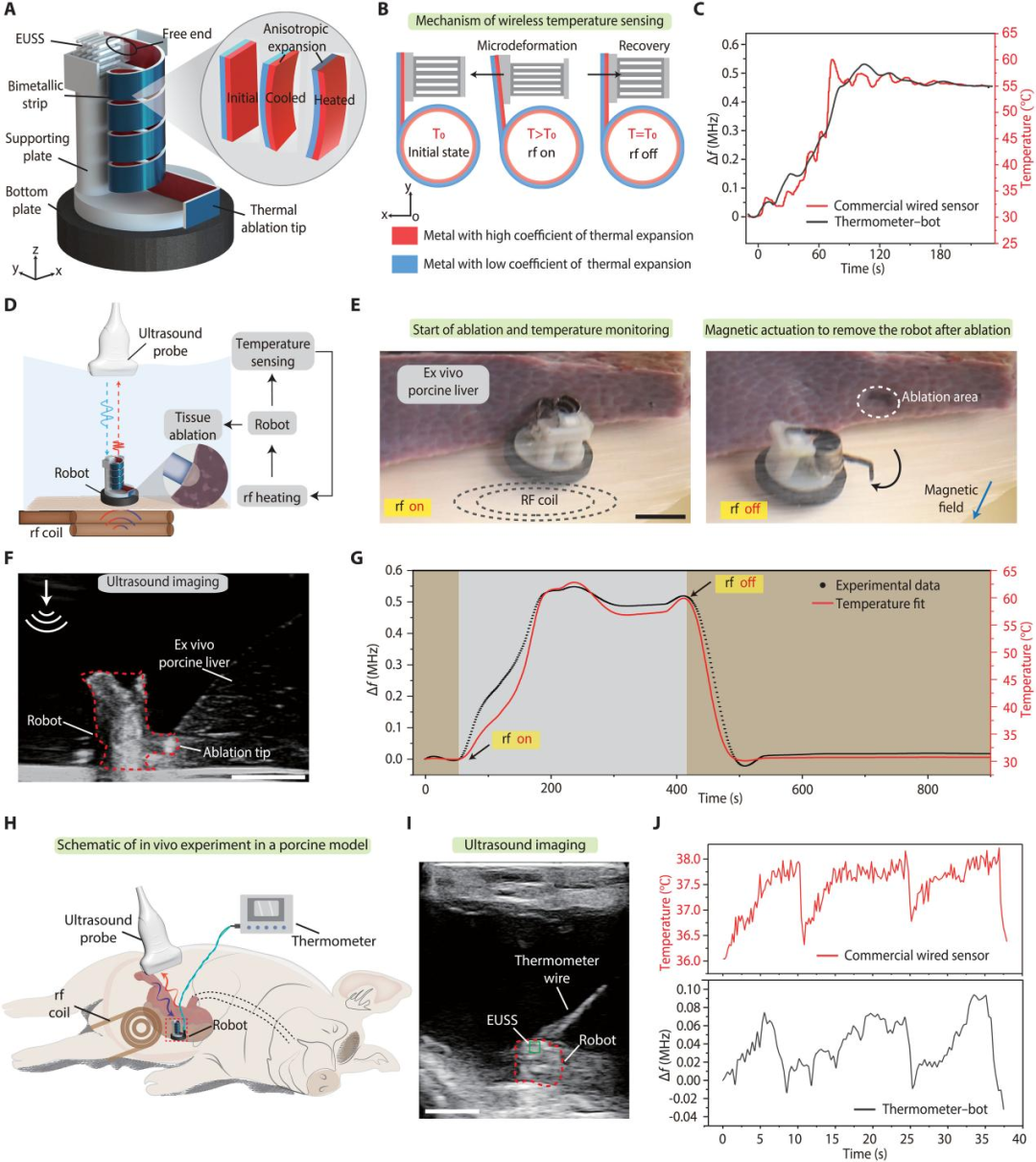 温度计机器人采用双金属螺旋结构作为热敏元件,其热膨胀效应会拉伸EUSS,引起频率变化。实验显示,在30°C–60°C范围内,该机器人的温度灵敏度为1200 Hz/°C,分辨率达0.31°C,完全满足临床热消融的反馈需求。