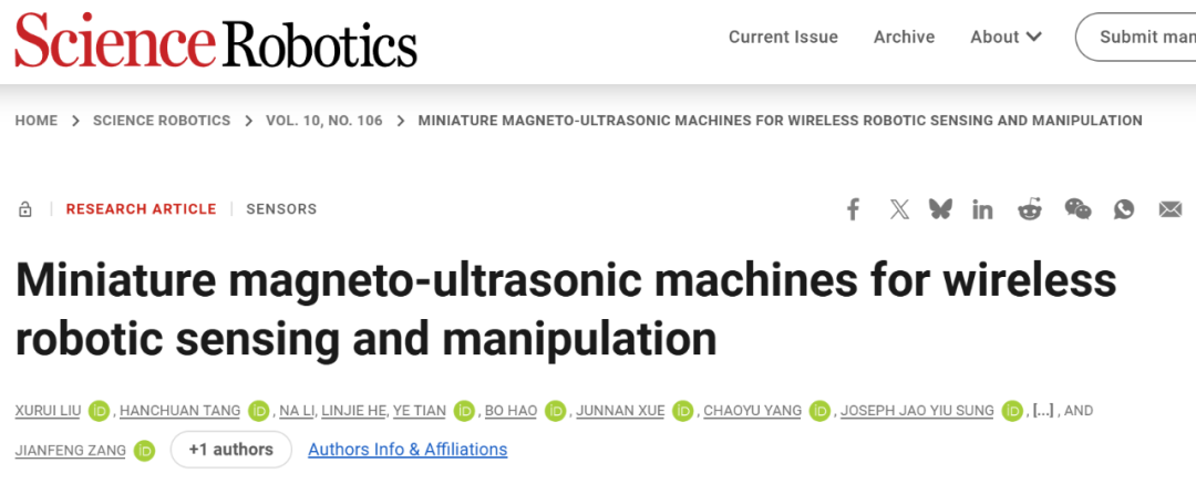 该成果以“Miniature magneto-ultrasonic machines for wireless robotic sensing and manipulation”为题发表在国际顶级期刊《Science Robotics》上