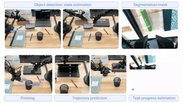 下面展示了Gemini Robotics-ER 1.5的部分能力,包括物体检测与状态估计、分割掩码、指向识别、轨迹预测以及任务进度评估与成功检测。