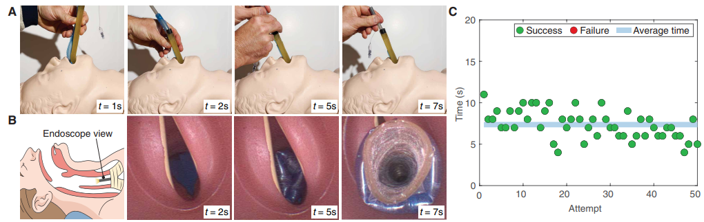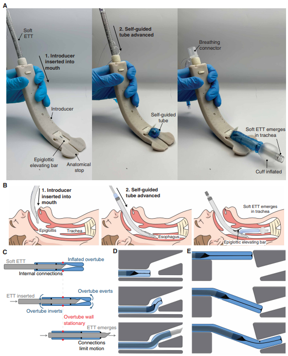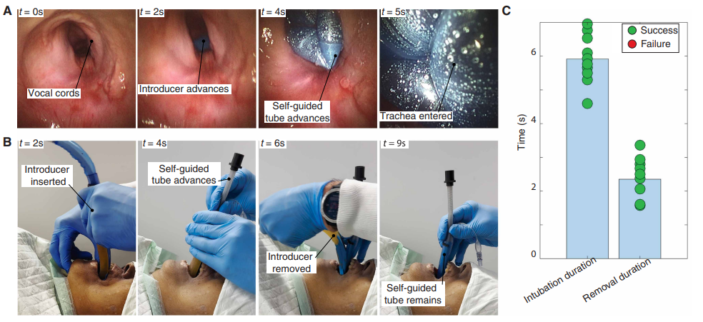 斯坦福大学、加州大学圣巴巴拉分校等机构的研究团队开发出一种软体机器人插管系统(SRIS),它能够自主导航进入气管,无需直视声门开口,甚至急救新手经过5分钟培训就能熟练使用。