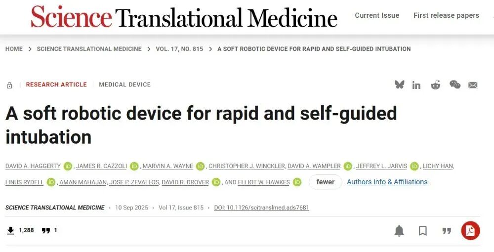 相关研究成果以:A soft robotic device for rapid and self-guided intubation为题,发表在《Science Translational Medicine》期刊上,并被Natrue亮点报道。这项突破性技术有望改变急救医疗,特别是在院前急救、战地医疗和医疗资源匮乏地区。