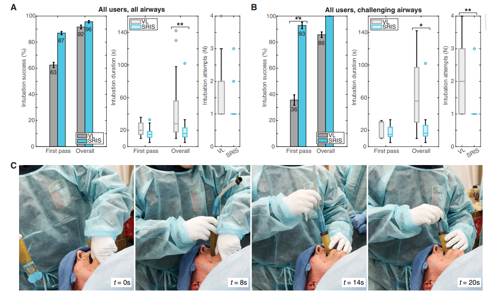 在最新的尸体模型实验中,这项技术展现出惊人的效果:首次插管成功率达87%,总体成功率高达96%,平均插管时间仅需21秒。相比之下,使用传统视频喉镜的成功率分别为63%和92%,平均耗时44秒。