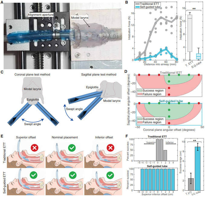 更重要的是,软体机器人展现出了极强的错位容忍能力。在尸体模型实验中,即使引导器偏离标准位置9厘米,软体机器人仍能成功插管,而传统导管的容错范围仅为2.5厘米。