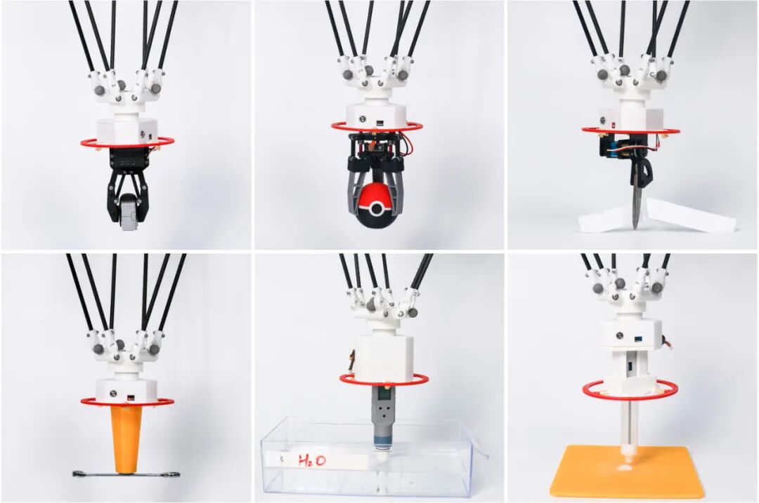 这是一套空中协同操作系统,由一架工具箱无人机和一架操作无人机组成(见图1)。工具箱无人机,顾名思义,能够携带多种不同类型的末端执行工具,如爪子、剪刀等(见图2),你可以想象为护士手里那个装满各种手术器械的托盘。而操作无人机,则是拥有可伸展的机械臂的那个“操作手”,你可以想象为主刀医生。