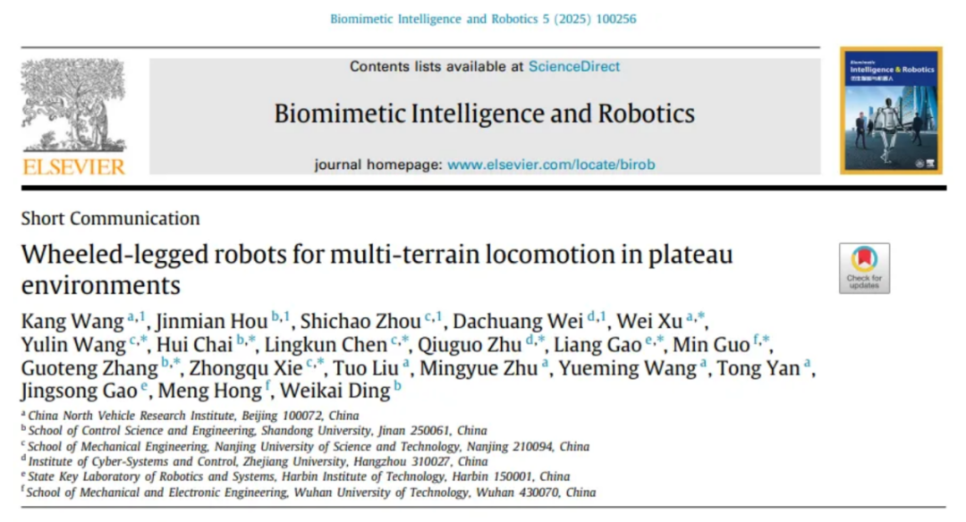 该成果以“Wheeled-legged robots for multi-terrain locomotion in plateau environments”为题发表在机器人相关期刊Biomimetic Intelligence and Robotics上。