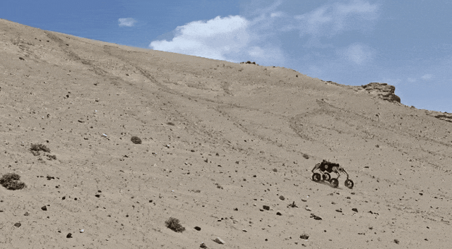 这些机器人在没有人工干预的情况下,成功完成了包括行走、转弯、爬坡、跨越沟渠和岩石等一系列动作。即使在最容易打滑的松软土坡上,机器人也能通过协调腿部和轮子的动作,稳步上行,展现出优秀的自主控制能力。