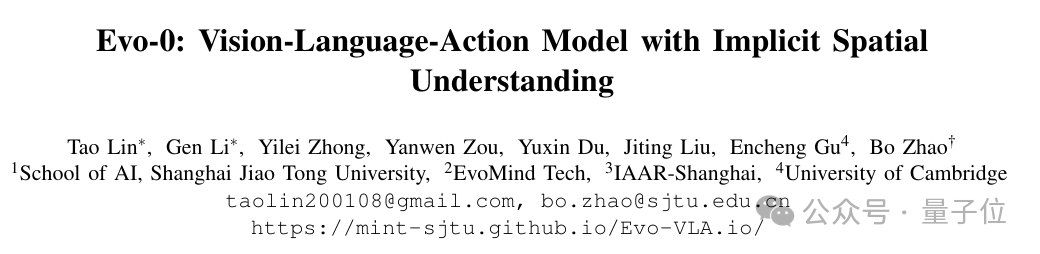 为此,上海交通大学和剑桥大学提出一种增强视觉语言动作(VLA)模型空间理解能力的轻量化方法Evo-0,通过隐式注入3D几何先验,无需显式深度输入或额外传感器。