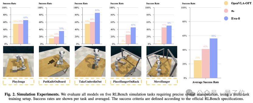 在rlbench仿真实验中,Evo-0在5个需要精细操作的任务上,平均成功率超过基线pi0 15%,超过openvla-oft 31%。