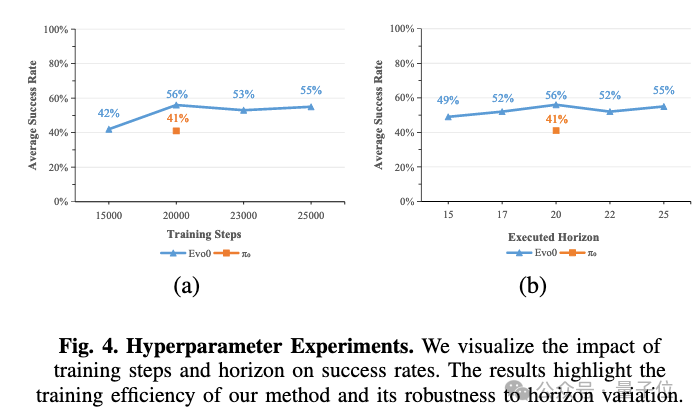 值得注意的是,仅用15k步训练的Evo-0已经超过了用20k步训练的π0,这表明Evo-0具有更高的训练效率。