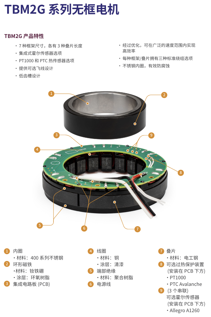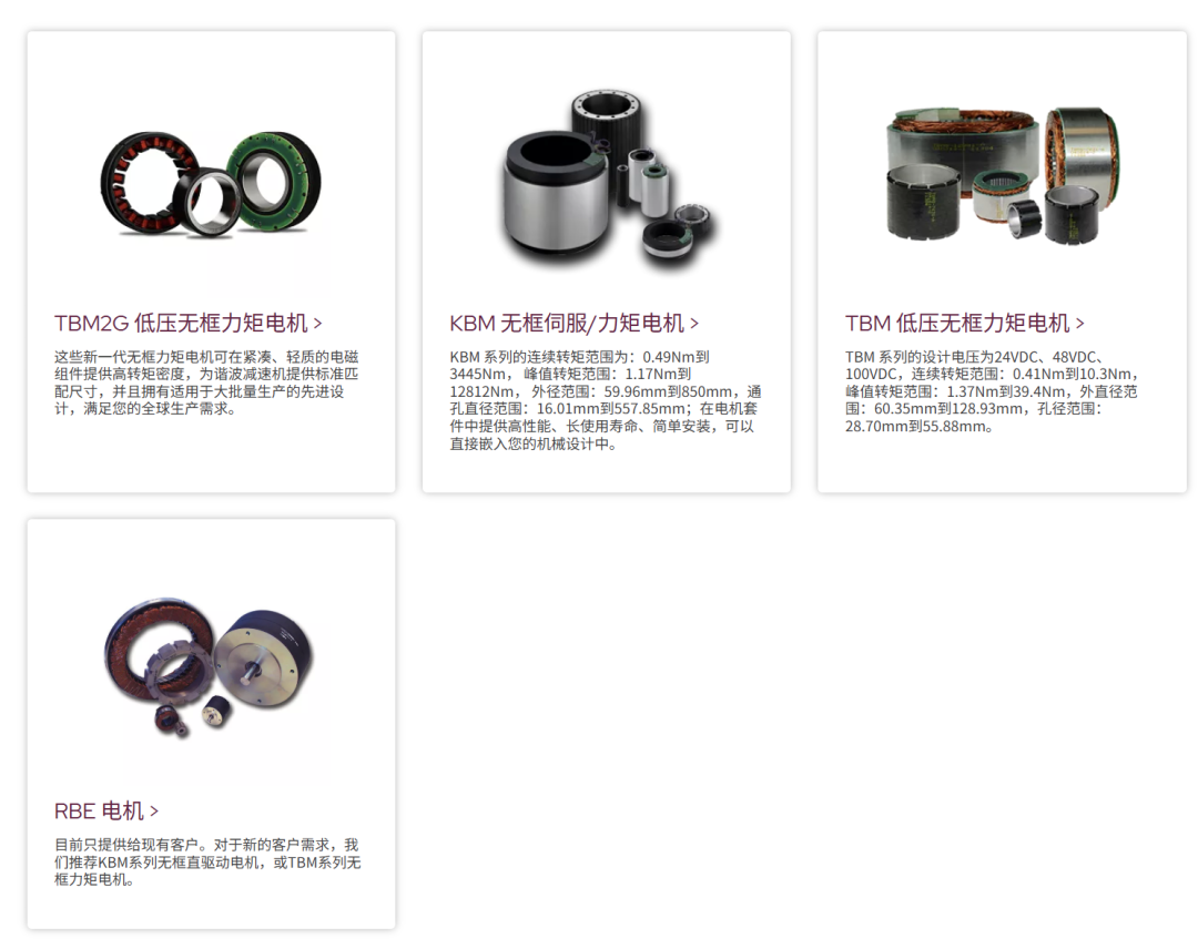 在国外,科尔摩根(Kollmorgen)堪称行业的领军者。这家拥有百年运动控制技术积累的企业,是无框力矩电机的发明者。其 TBM 系列无框力矩电机专为机器人设计,采用先进的绕组与材料,解决了传统无框电机 “低速性能差” 的痛点,可在全速度范围内保持高功率、高转矩与高效率,产品与常用谐波减速机高度适配,无需大规模定制,占据着全球高端机器人市场的主导地位 。