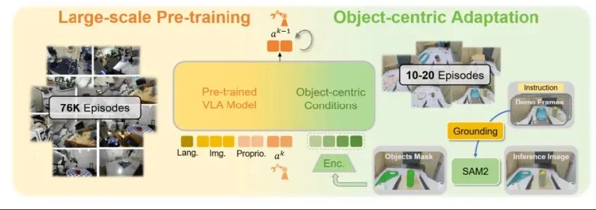 团队先在包含 7.6 万段操作数据的 DROID 数据集上,预训练一个基础 VLA 模型。这个模型能处理 RGB 图像、语言指令(比如 "把杯子放到浅色盘子上")和机器人关节状态等多模态信息,就像给机器人打下 "会看、会听、会动" 的基础。