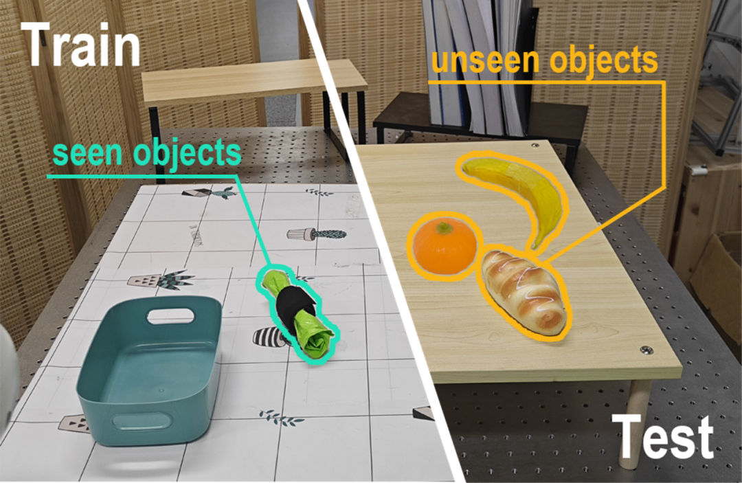 机器人在真实世界遇到的情况,不可能和训练时完全一样。团队特意测试了 ControlVLA 对未知物体和背景的适应能力: