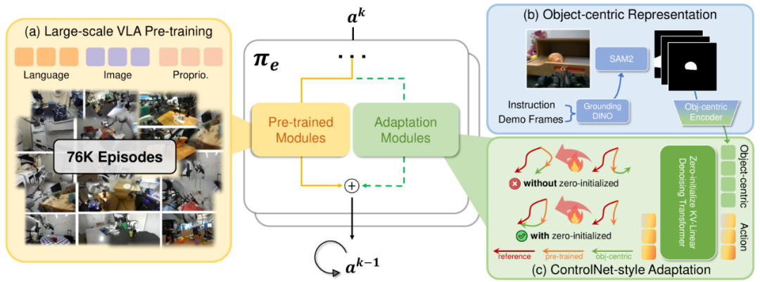 ControlVLA 的核心思路,是给强大的预训练 VLA 模型加装一个 "对象导航仪"—— 通过物体中心表示(Object-centric Representation)精准定位任务关键物体,再用 ControlNet 风格的微调方式,让模型在保留通用能力的同时,快速掌握具体任务细节。