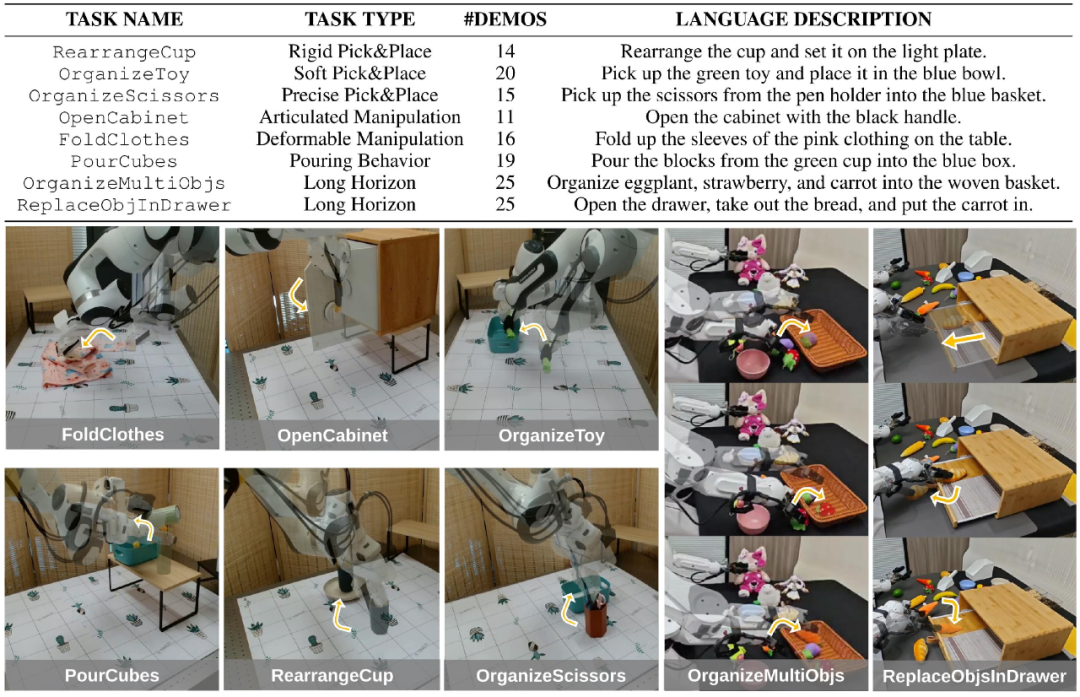 团队在 8 项真实世界任务中测试 ControlVLA,涵盖了不同类型的操作挑战: