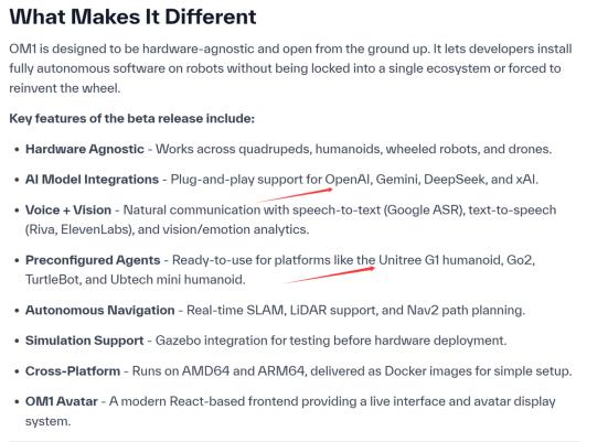 开源阵营已具备先发优势。近期,Open Mind推出了OM1Beta系统,作为全球首个“AI原生”开源平台,它不仅支持UnitreeG1人形机器人、Go2、Turtle Bot和Ubtech等机器人等平台,还支持接入Open AI、Gemini等第三方大模型,甚至提供前端交互界面简化操作。这类开源项目以“免费+协作”模式快速抢占开发者心智,Meta若选择闭源路线,将面临生态扩张速度的劣势;若跟进开源,则需承担巨额研发成本却无直接收益。