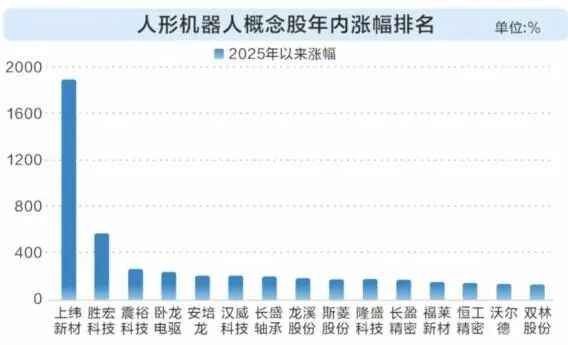 据统计,人形机器人概念股年内平均上涨83.6%,跑赢同期上证指数,其中,上纬新材年内累计上涨1891.6%,成为年内A股涨幅榜冠军。