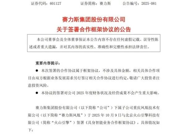 10月10日消息,近期刚宣布投资115亿元入股华为汽车智能平台的赛力斯(601127.SH)发布公告称,赛力斯集团股份有限公司下属子公司重庆凤凰技术有限公司(以下简称“赛力斯凤凰”) 与北京火山引擎科技有限公司(简称“火山引擎”)签署《具身智能业务合作框架协议》。