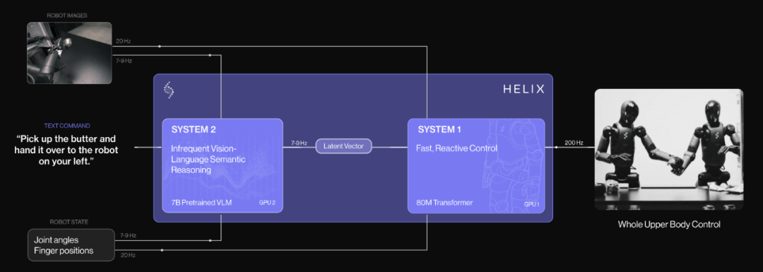 Figure坚信,真正的具身智能需要软硬件的深度垂直整合。在短暂与OpenAI合作后,Figure果断转向完全自研其核心AI模型——Helix。Helix是一个专为机器人设计的视觉-语言-行为(VLA)模型,其创新的“双系统”架构是其核心优势: