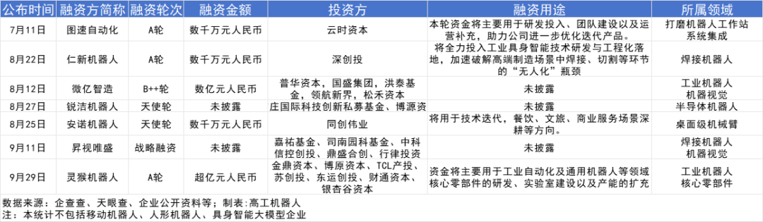 据高工机器人不完全统计,2025年Q3中公开披露完成新一轮融资的工业机器人企业有7家,包括仁新机器人、昇视唯盛、微亿智造、灵猴机器人、安诺机器人、锐洁机器人、图速自动化等。