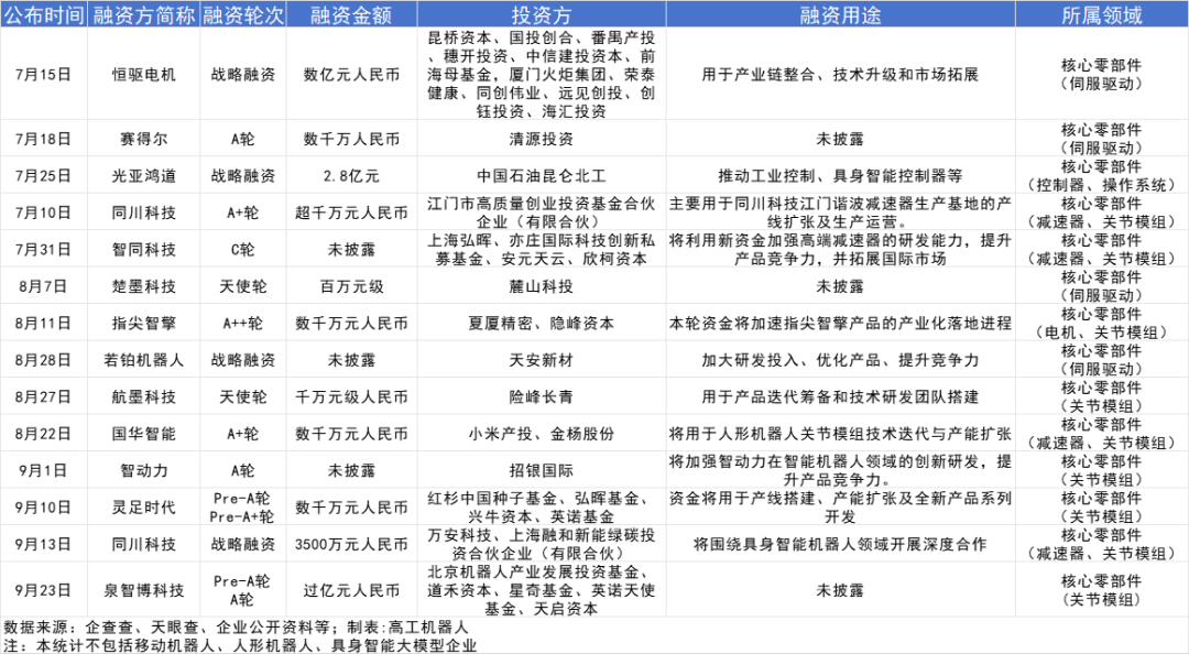 如智动力、智同科技、同川科技、泉智博、灵足时代、指尖智擎、航墨科技、国华智能等均涉及关节模组的研发销售,上述企业融资所得资金,也大多用于加强在高端减速器、微型电机、轻量化关节模组等产品的研发投入和产能扩张。