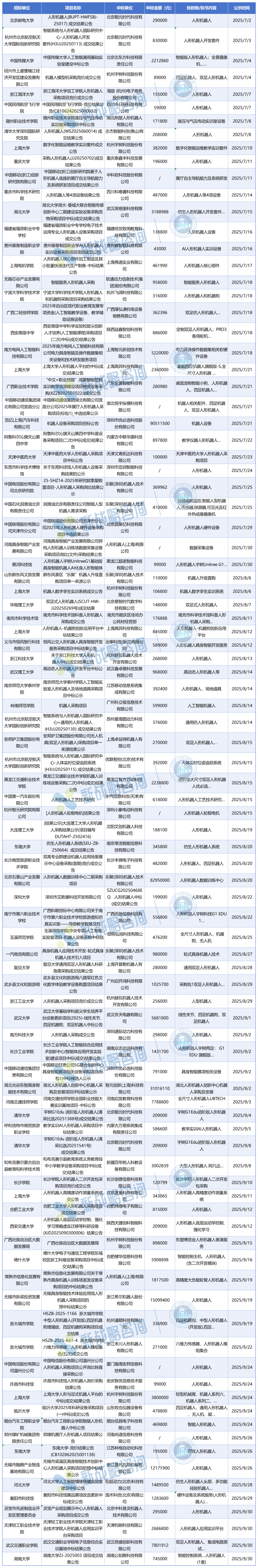 据人形机器人场景应用联盟不完全统计,2025年第三季度,国内公开披露的人形机器人中标项目数量已超过94个,披露的合同金额合计近3.2亿元人民币。(不包括面向K12教育的小型桌面设备机器人,不包括基地及实验室工程建设项目)