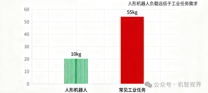 目前主流人形机器人的手臂负载多在5–10公斤之间,即便是国际某领先厂商推出的Optimus型号,最大负载也仅为15公斤。然而,工厂中的典型任务往往远超这一范围:汽车底盘搬运通常要求50公斤以上,机床加工件多在20–30公斤之间,家电厂搬运冰箱箱体也需至少15公斤的负载能力。
