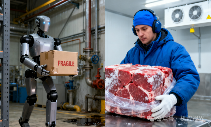 图5:人形机器人搬轻箱子VS 工人冷库中搬运冻品