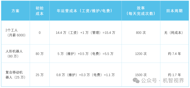 很明显:人工是“纯支出”,人形机器人要7年多才能回本——这意味着“还没回本,机器人就该换代了”;而复合移动机器人1年多就能赚钱,对工厂来说,这才是“靠谱的投资”。