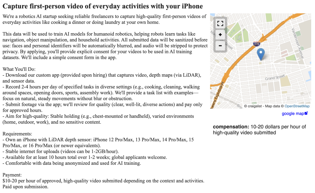 甚至有某机器人初创公司自己在Craigslist发广告,以10–20美元时薪征集用户用手机拍摄家务的视频。