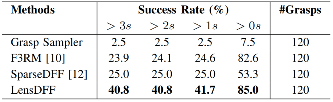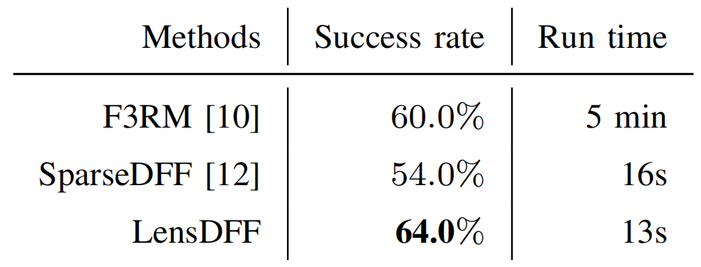 到了真实世界实验阶段,团队选取了 5 类典型物体进行实地测试,结果显示 LensDFF 的成功率为 64.0%,相比 F3RM(60.0%)高出 4 个百分点,比 SparseDFF(54.0%)高出 10 个百分点。更关键的是,LensDFF 的单次推理时间仅需 13 秒,不仅远低于 F3RM 所需的 5 分钟,还比 SparseDFF 的 16 秒略快,真正实现了性能与效率的双重领先。